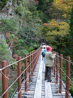 おびお版平家物語を旅しよう 樅木の吊り橋はもともと通学のために架けられていた橋でしたが、昭和49年に掛け替えが行われた際に観光用の吊り橋として架橋されました。水面まで38メートルの高さにある「あやとり橋」と川面に近い(といっても18メートル)ところにある「しゃくなげ橋」の二つの橋が近接してかけられていて、両者が遊歩道で結ばれているため、駐車場から対岸を一筆書きで周遊する遊歩道となっています。